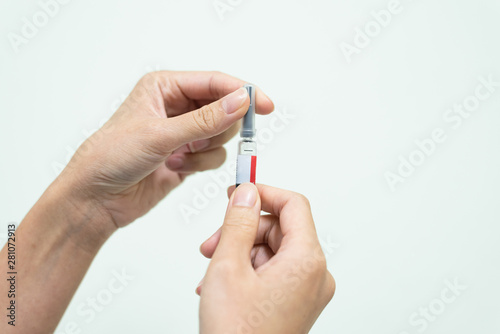 Close up doctor's hand holding syringe for vaccine to patient on white background.Nurse using syringe are vaccination to patient for influenza protection.Medication treatment concept.