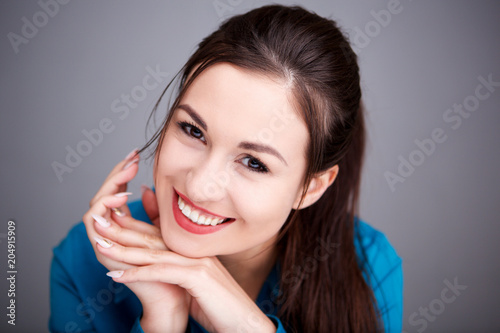 adult, attractive, background, beautiful, beauty, casual attire, caucasian, cheerful, confidence, confident, cool, copy, cute, elegance, elegant, enjoy, face, fashion, female, girl, grey, hair, hand, happiness, happy, lifestyle, looking, make-up, model, modern, 1, people, person, portrait, posing, positive, pretty, shirt, skin, smile, space, studio, style, stylish, wall, white, woman, young