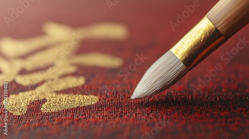 chinese new year, calligraphy, brush, paintbrush, gold, red, fabric, texture, art, asian, chinese, japanese, korean, writing, lettering, script, detail, closeup, macro, background, design, elegant, luxury, culture, tradition, craft, hand-made, artistry, painting, stroke, ink, gold, precise, delicate, symbol