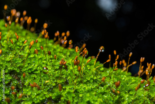 Close up green moss in forest after rain