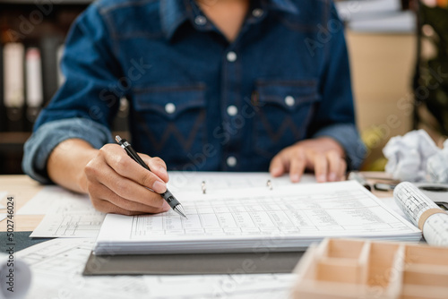Close up hands of an engineer working and checking on blueprints. Engineer planning project on paperwork with equipment.