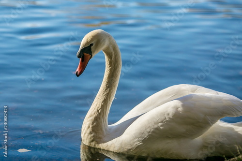 mute swan, blue, lake, bright, closeup, adult, day, sunny, eltern, water surface, water bird, river, red, cygnet, white, bird, yellow, clean, water, duck pond, park, outdoors, fall, autumn, colours, elegance, swimming, beak, beautiful, feather, animal, wild, wildlife, nature, black, shadow, sky