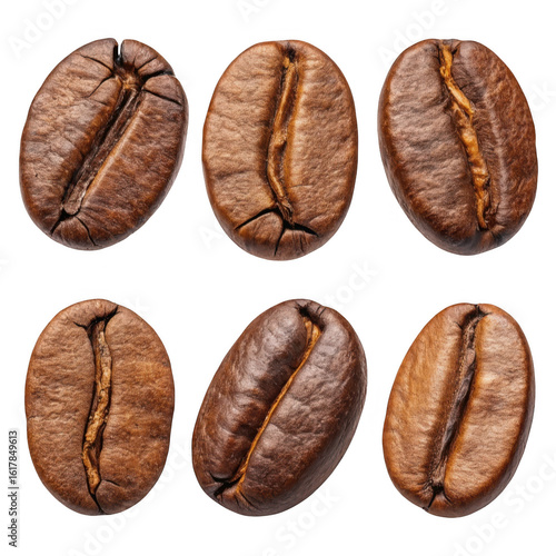 Close up macro view of six roasted dark brown coffee beans with detailed texture and natural imperfections isolated on transparent background