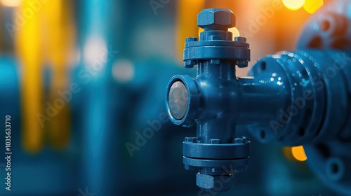 Close up of a blue steel industrial valve component in an oil and gas pipeline or processing equipment Concept of industrial engineering energy infrastructure and factory maintenance