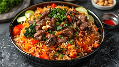 rice, meat, vegetable, bowl, food, dish, cookery, meal, dinner, lunch, delicious, healthy, tasty, epicure, fresh, cooked, plate, eatery, table, closeup, herb, lime, wedge, parsley, cilantro, tomatoes, carrot, onion, garlic, ginger, spice, seasoning, asian, indian, middle eastern, ethnic, homemade, presentation, style, nourishment, diet, receipe, culinary, art, photo, studio, shot, still life, cashew