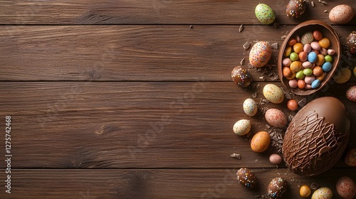 Close up of a cracked open chocolate Easter egg revealing a vibrant assortment of colorful candies nestled inside placed on a rustic wooden table with negative space for text or design elements