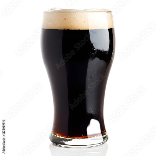 Close up of a dark stout beer in a pint glass with frothy head and amber hue