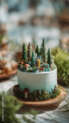 Close up of a decorated birthday cake with trees and mushrooms on a wooden cake stand outdoors