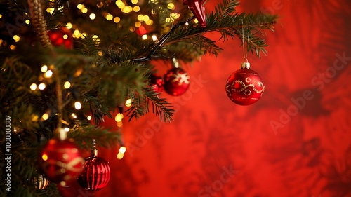 Close up of a decorated christmas tree with warm glowing lights and red ornaments against a textured red background