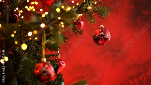 Close up of a decorated christmas tree with warm glowing lights and red ornaments against a vibrant red background