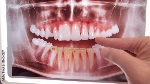 Close up of a dental X ray on a lightbox showing cavities and periodontal issues with a dentist pointing at the problem areas ideal for medical themes
