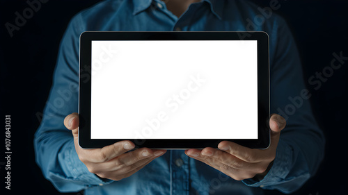 Close up of a digital tablet in man's hands.man holding a tablet with white screen in hands.