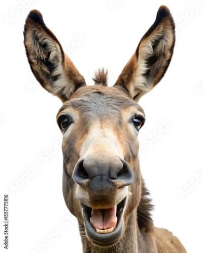 Close up of a donkey face with a wide open mouth and large ears showing teeth and tongue isolated on a transparent background