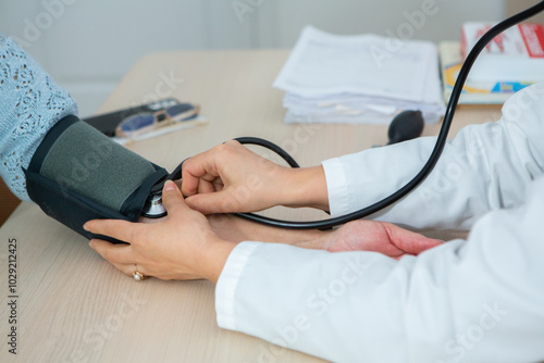 Close up of a female doctor sitting at the desk in the office. Doctor measuring blood pressure of patient in hospital. Medical and healthcare concept.