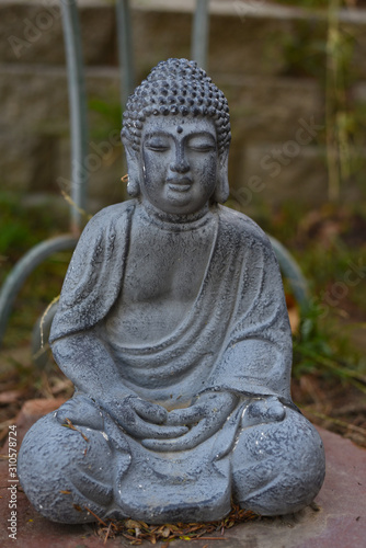Close up of a gray stone Budda statue