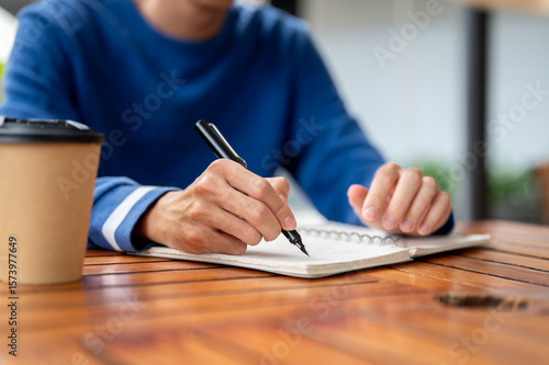 Close up of a hand holding pen writing in notebook aside coffee at wooden table in cafe or canteen.