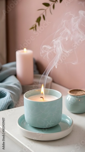 candle, lit candle, flames, smoke, aroma, fragrance, relaxation, wellness, cosy, comfort, home decor, interior design, lifestyle, still life, table setting, tabletop, minimalist, modern, pastel, pink, blue, ceramic, glasses, light, warmth, atmosphere, mood, serenity, peaceful, calm, spa, beauty