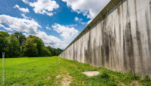 close up of a monochrome concrete wall covered in various stains, creating a stark contrast against a backdrop of green grass and natural landscape
