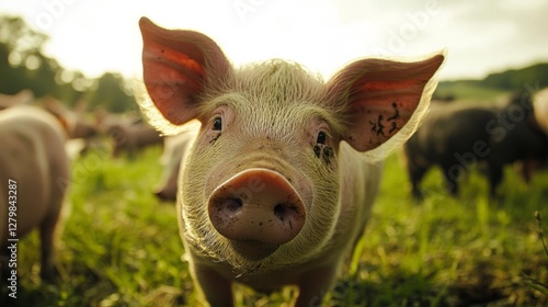 pig, baby pig, farm, animal, domestic, mammal, farm animal, agriculture, rural, countryside, nature, wildlife, portrait, close, up, cute, adorable, pink, white, muddy, grass, green, field, outdoors, sunlight, warm, summer, daytime, happy, healthy, young, animal, farming, photo, scene, agricultural, closeup, snout, sow, boar