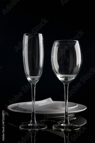 vertical, black background, catering, champagne glass, clarity, clean, clear, closeup, close-up view, cutlery, daylight, detail, drinking, drinking glass, empty, entertainment, equipment, exclusivity, expensive, fine dining, flute, glassware, hospitality, luxury, napkin, no people, nobody, organisation, place setting, plate, plate, preparation, pristine, eatery, rich, service, silverware, still life, studio shot, table setting, tableware, 2, wealth, wine, wine glass