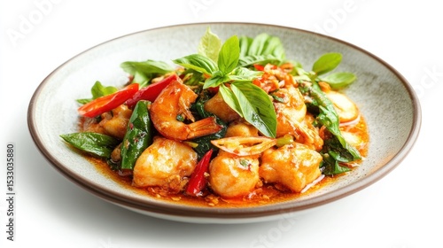 shrimp, tofu, sauce, basil, pepper, white, plate, food, dish, cookery, meal, lunch, dinner, delicious, fresh, healthy, epicure, tasty, cooking, eatery, asian cuisine, thai food, red pepper, closeup, food photography, thai cuisine, asian cuisine