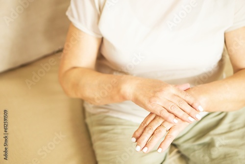 Close up of a senior woman appllying hand cosmetic cream at home.