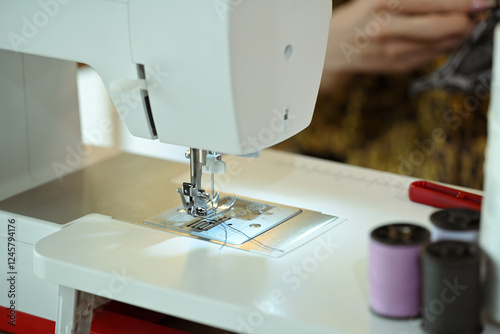 Close up of a sewing machine with thread and fabric at fashion designer workspace