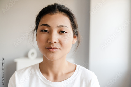 Close up of a smiling young asian woman relaxing