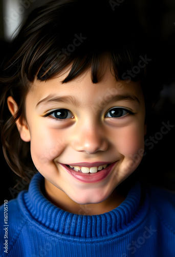 Close up of a smiling young girl in blue sweatshirt, vintage, with white tones