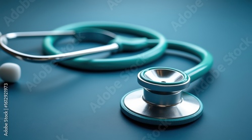 stethoscope, medicals, health care, doctor, nurse, medicine, health, diagnosis, patient, clinic, hospital, equipment, instrument, listening, heartbeat, lung, exam, check-up, wellness, treatment, pharmacy, drug, pill, capsule, teal, blue, background, close, up, detail