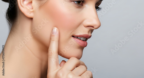 Close up of a woman's face with her finger touching her cheek in a profile view shot