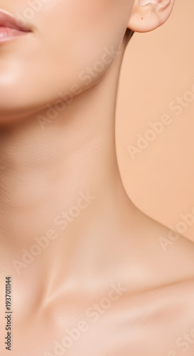 Close up of a woman's smooth neck and jawline with soft lighting and a neutral peach background highlighting delicate skin texture and elegant bone structure.