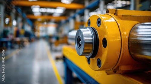 Close up of a yellow hydraulic cylinder and steel rod assembly inside a factory with blurred background