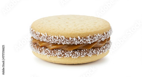 Close up of alfajor de maicena with coconut edges isolated on a white background for dessert or snack uses