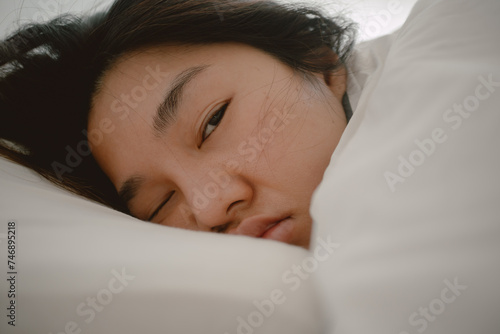 Close up of asian Thai woman closing eyes, sleeping on white bed with white blanket covering in the morning at room apartment.