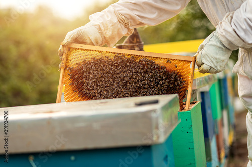 Close up of beekeeper hands working with bees and beehives on the apiary.