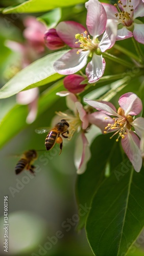 Close up of bees pollinating flowers vibrant spri