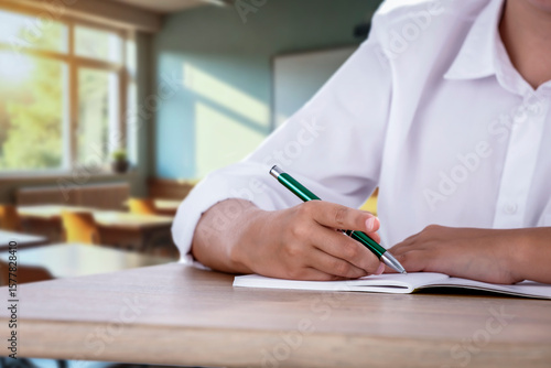 Close up of boy hand writing in notebook at school desk with blurred classroom background. Learning, back to school, childhood education, or studying concept.