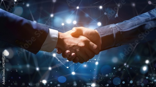 Close up of business man shaking hands against technology background, leader, teamwork, target, Aim, confident, achievement, goal, on plan, finish, generate by AI