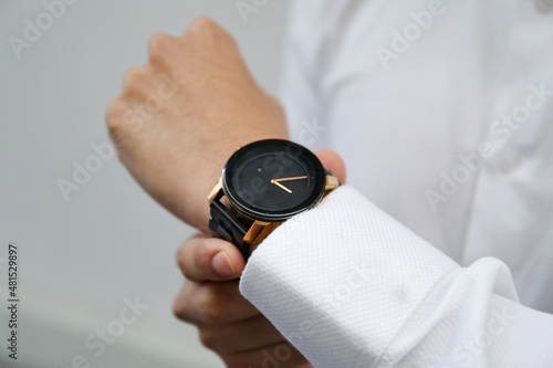 Close up of businessman or groom looking at watch on his hand outdoors, free space. Man in white shirt checking time from luxury wristwatches. Watch on hand. Groom wedding preparation.