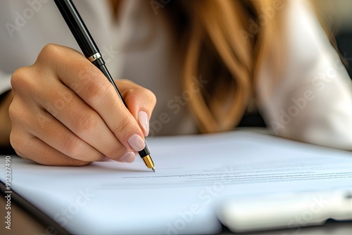 Close up of businesswoman hand signing contract or agreement with pen