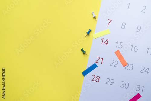close up of calendar on the table with yellow background, planning for business meeting or travel planning concept