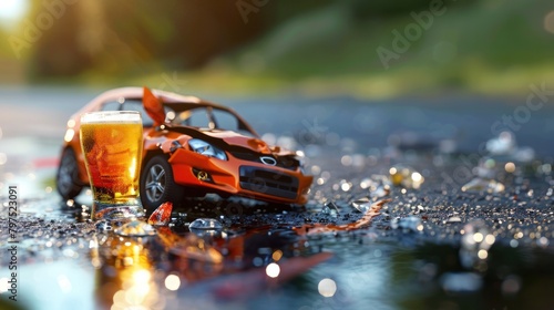 Close up of car model and glass of beer crashing together on the road. Car accident and insurance concept.