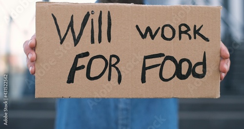 Close up of carton poster with words Will work for food in male hands outdoor. Caucasian workless man holding table with unemployment slogan.
