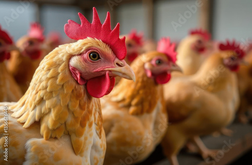 close up of chickens in farm with focus on one hen with red comb in foreground. poultry farming concept. agriculture, livestock, rural life, food industry