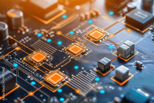 circuit, board, technology, glowing, connection, electronic, component, closeup, digital, hardware, microchip, network, futuristic, design, pattern, electricity, innovation, engineering, system, datum, communication, processor, integrated, semiconductor, tech, detail, structure, connection, light, orange, blue, wire, energy, modern, science, computing, equipment, electric, abstract, industry, development