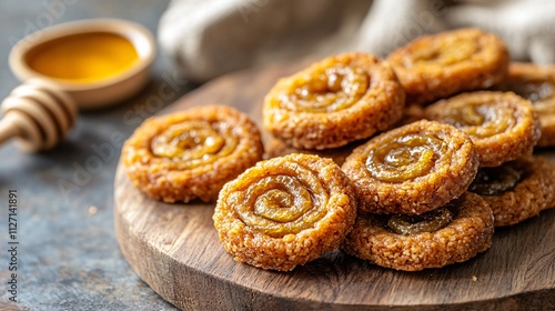 Close up of date pinwheel cookies with a crispy edge, served on a rustic cutting board with honey drizzle