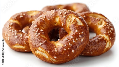 Close up of delicious fresh baked pretzels with salt on white background studio shot food photography