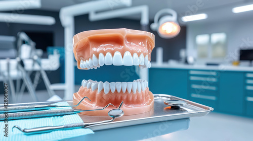 close up of dental model showcasing radiant smile with dental tools on tray, highlighting dental care
