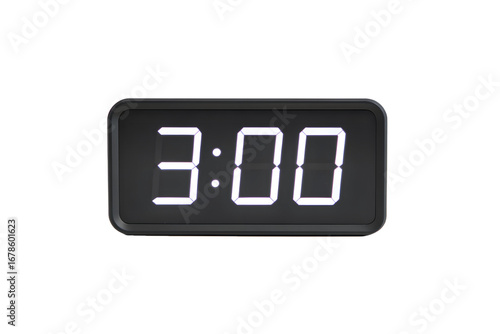 Close up of digital alarm clock displaying 3:00, photorealistic, on white background.